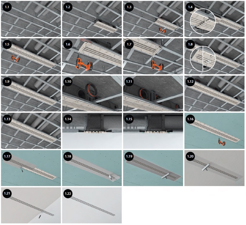 Tieto vzduchové výuskty ERGOVENT sú integrovane do sadrokartónového stropu a potom tmelené a natreté rovnakou farbou ako strop. Viditeľný zostáva iba estetický otvor pre prúdenie vzduchu.